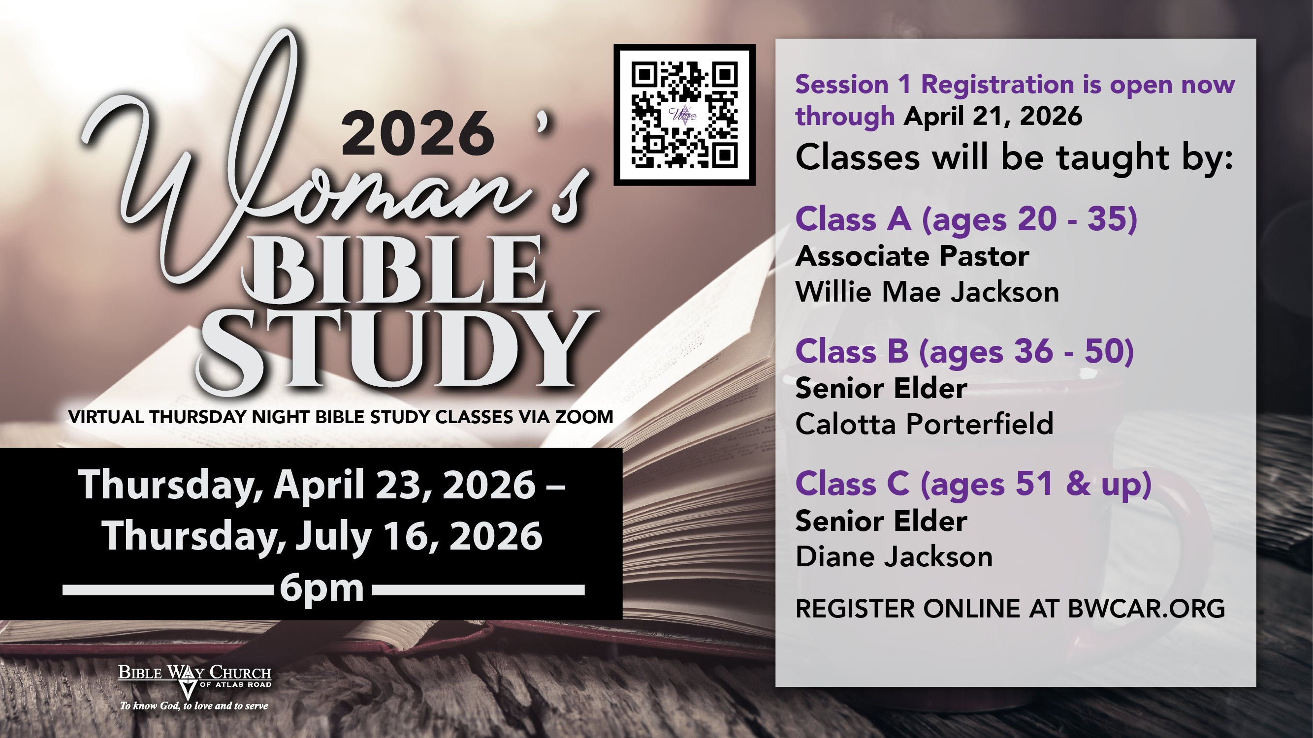 Registration for Session 2 of Women’s Virtual Thursday Night Bible Study Classes is now open through Tuesday, April 21. Session 2 classes will be held via Zoom Thursday, April 23 – July 16, at 6:00pm.