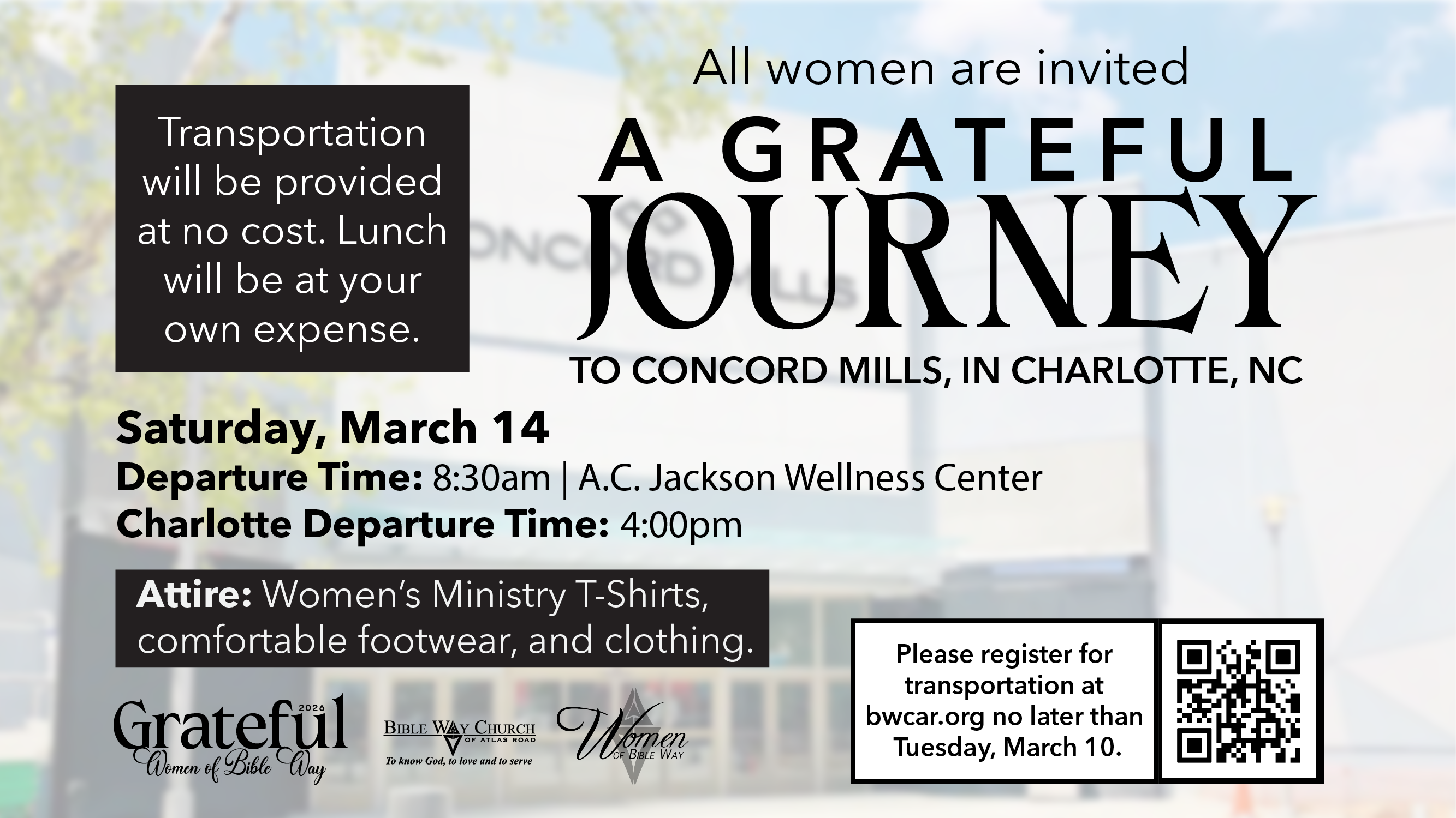 All women are invited to join us for A Grateful Journey to Concord Mills, in Charlotte, NC.