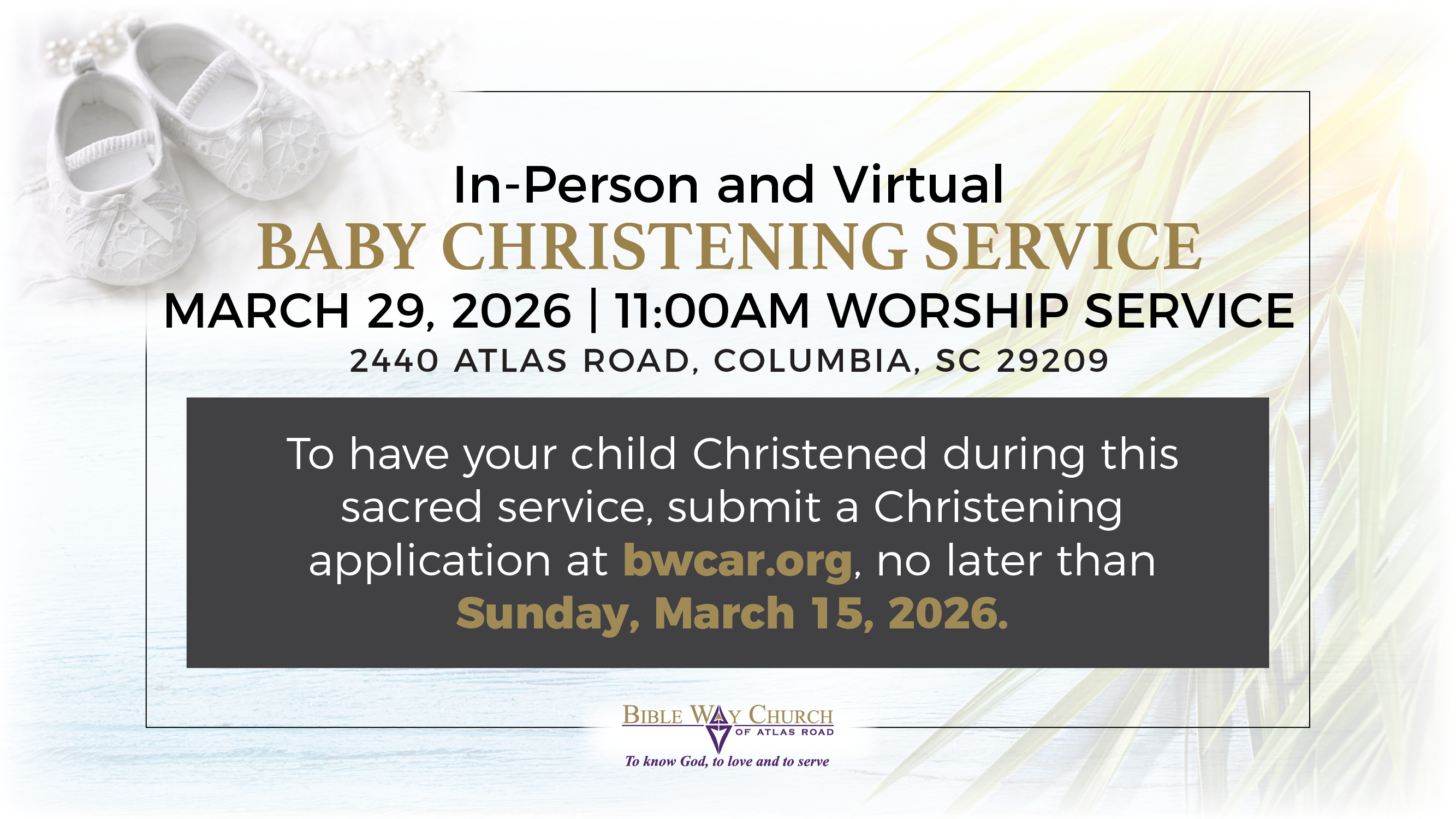 Christening will be held during the 11:00 am worship service in the Worship Center.