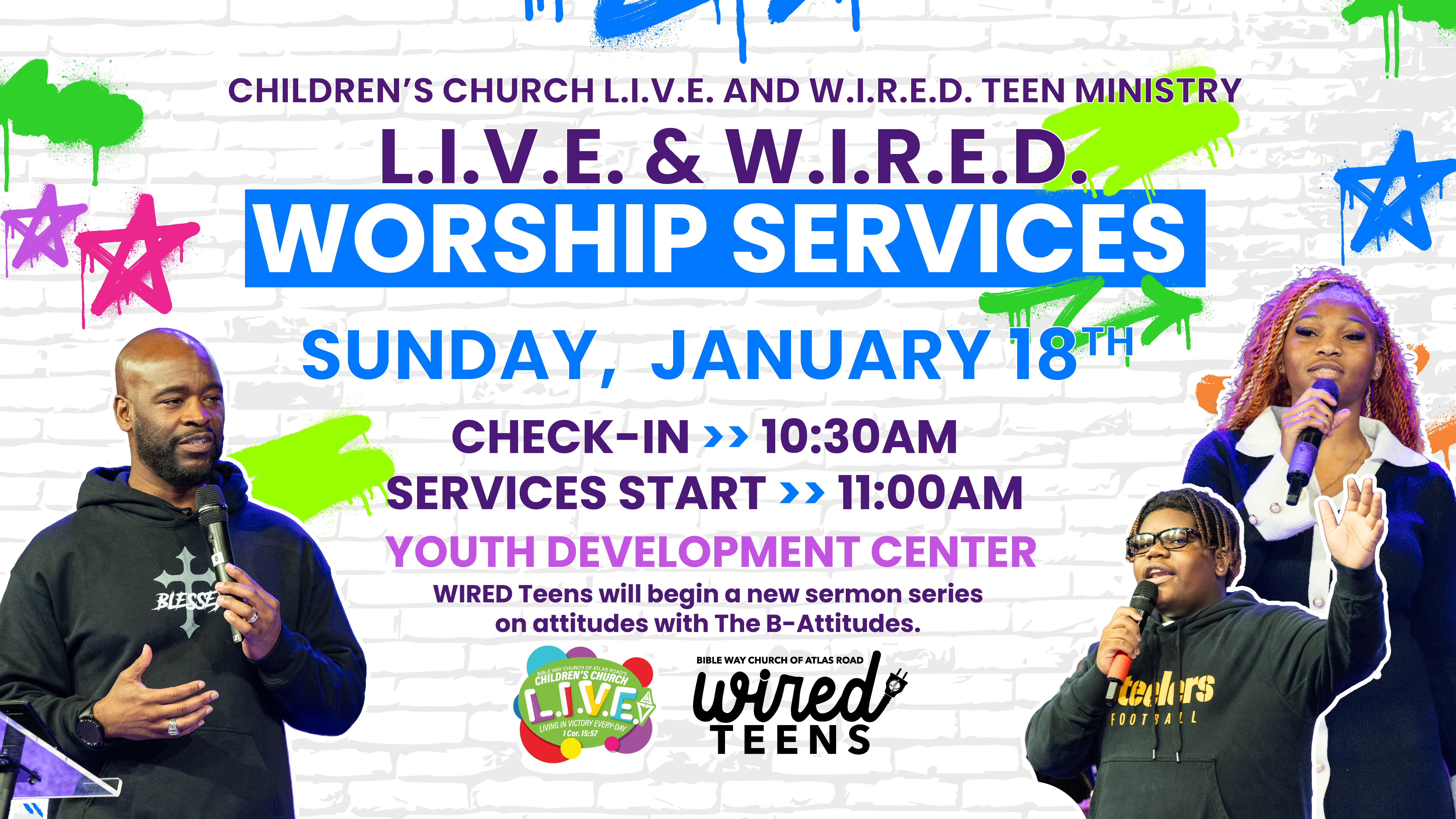 Come on over to the Youth Center for powerful, fun, and high impact worship. We look forward to seeing all children and teens there! Check-in starts at 10:30am, and both services begin at 11:00am. WIRED Teens will begin a new series that will focus on the B-Attitudes.