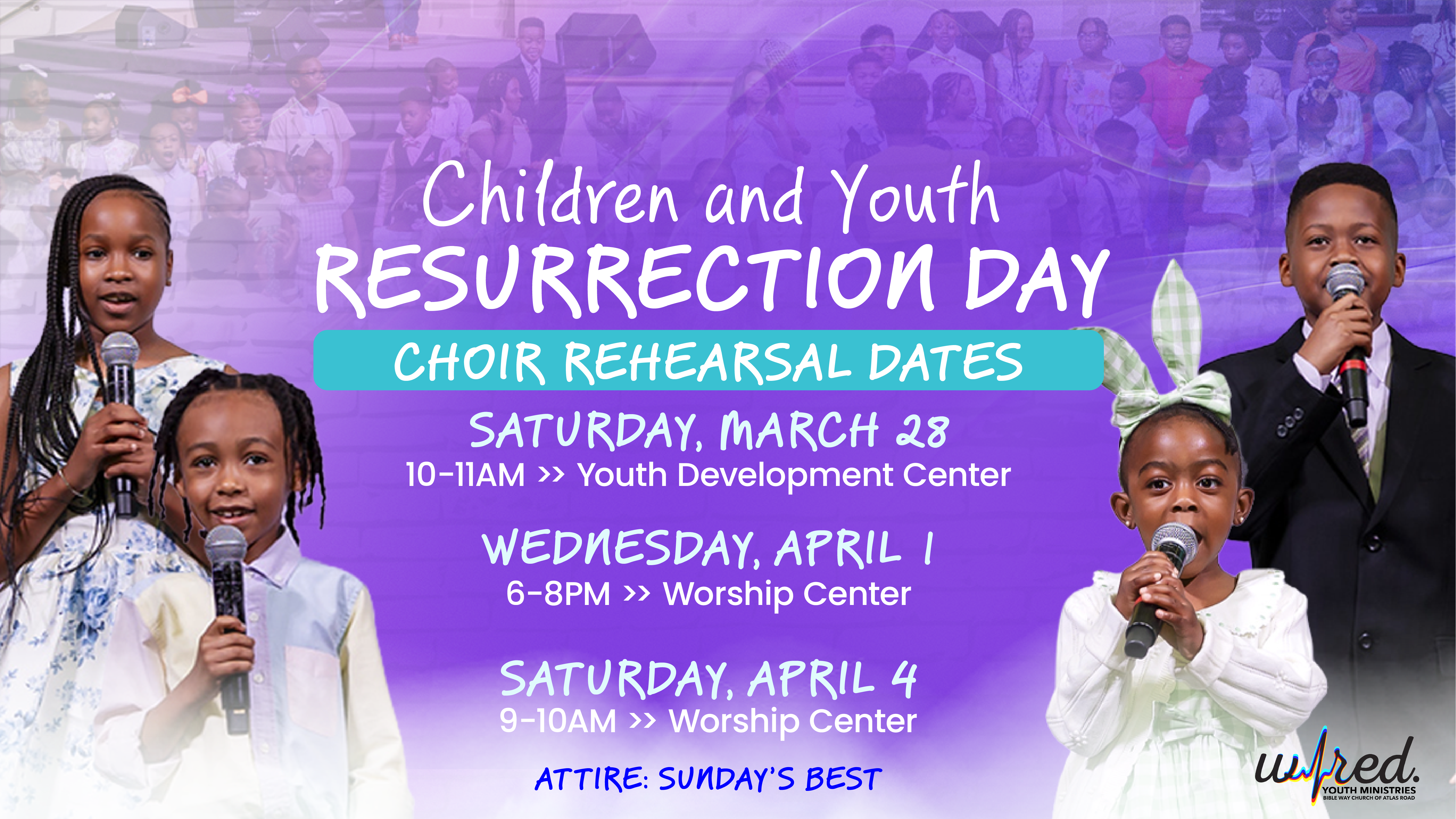 Children and Youth Resurrection Day Choir is forming and we’re asking parents to allow all children and youth to participate. Rehearsals will be held Wednesday, April 1 from 6:00pm-8:00pm in the Worship Center for a full run through, and Saturday, April 4, from 9:00am-10:00am in the Worship Center. The attire is Sunday Best!