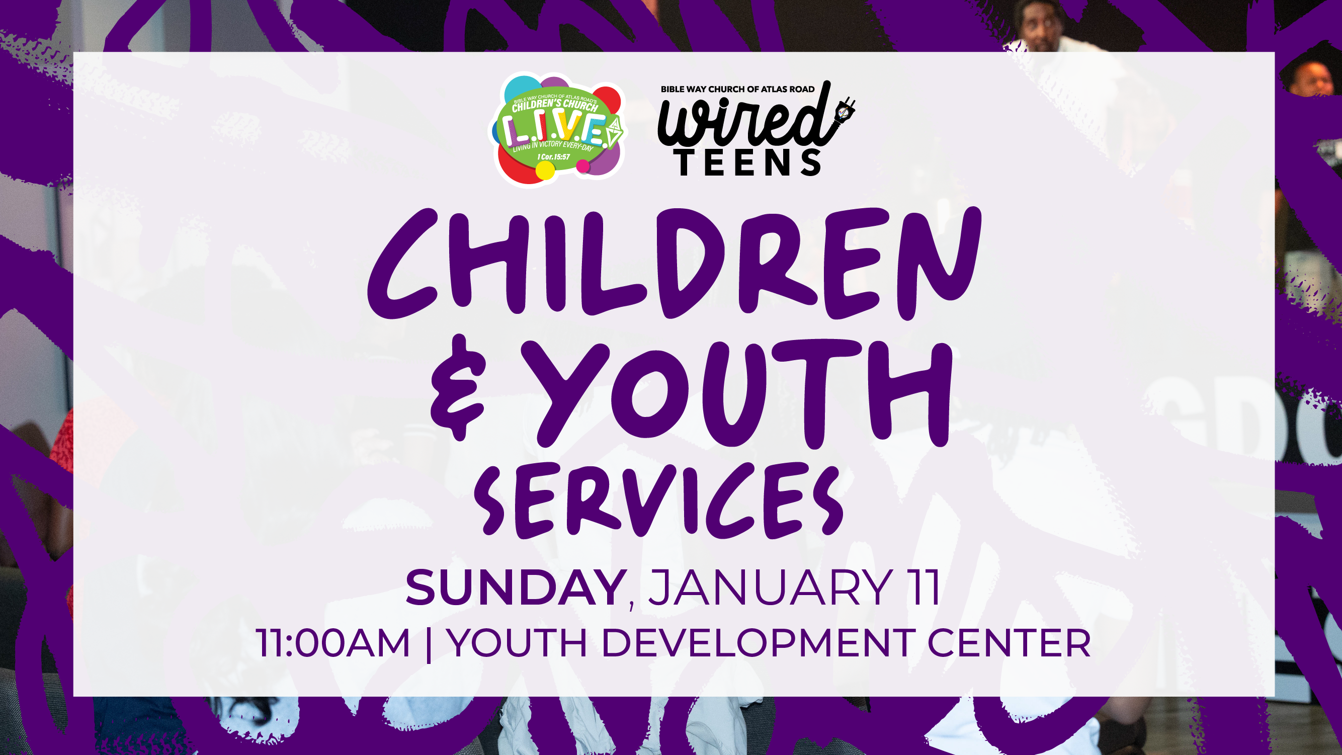Children and Youth Services will have its first service of 2026 at the Youth Development Center. Services begin at 11:00am.