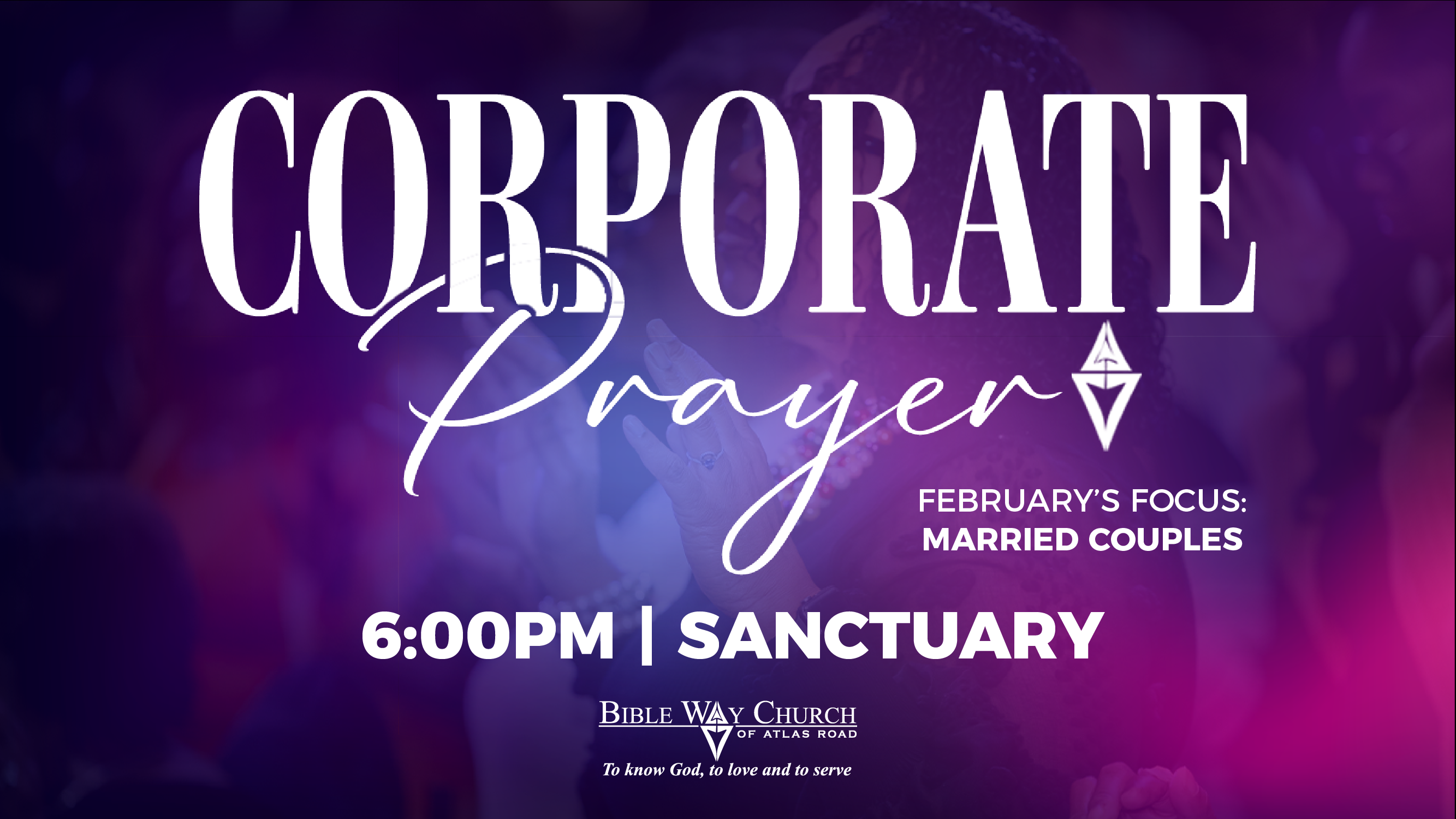 Corporate Prayer will be held at 6:00pm in the Sanctuary. There is a new focus for a new month. The focused prayer in February is on Married Couples.