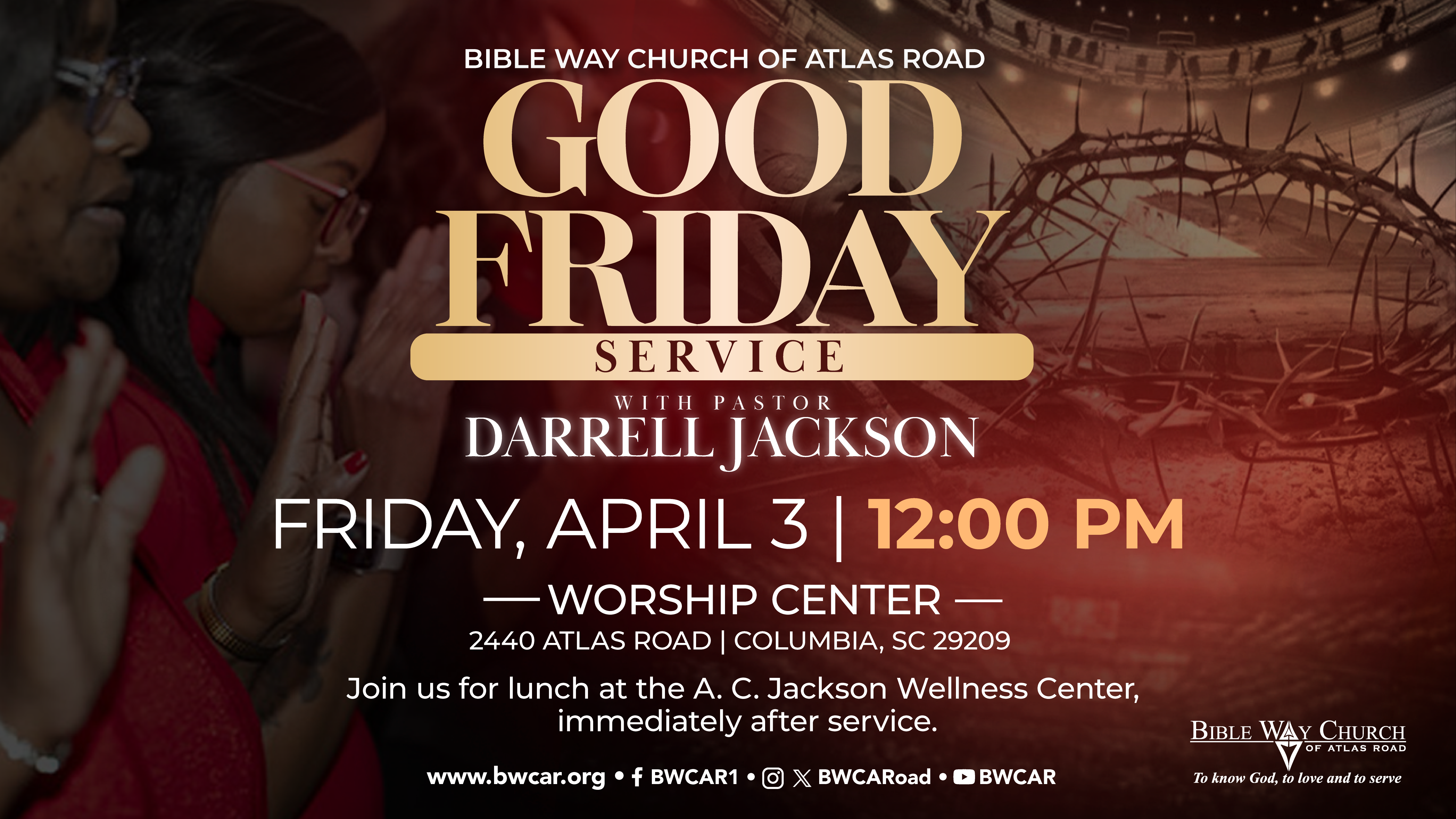 Holy Week will conclude with a special noon day Good Friday service with Pastor Darrell Jackson. Join us at 12:00pm in the Worship Center for this special service. After service, everyone is invited to the A. C. Jackson Wellness Center as we fellowship together with lunch. Be sure to tell your family and friends that Good Friday at Bible Way will be held at noon this year!