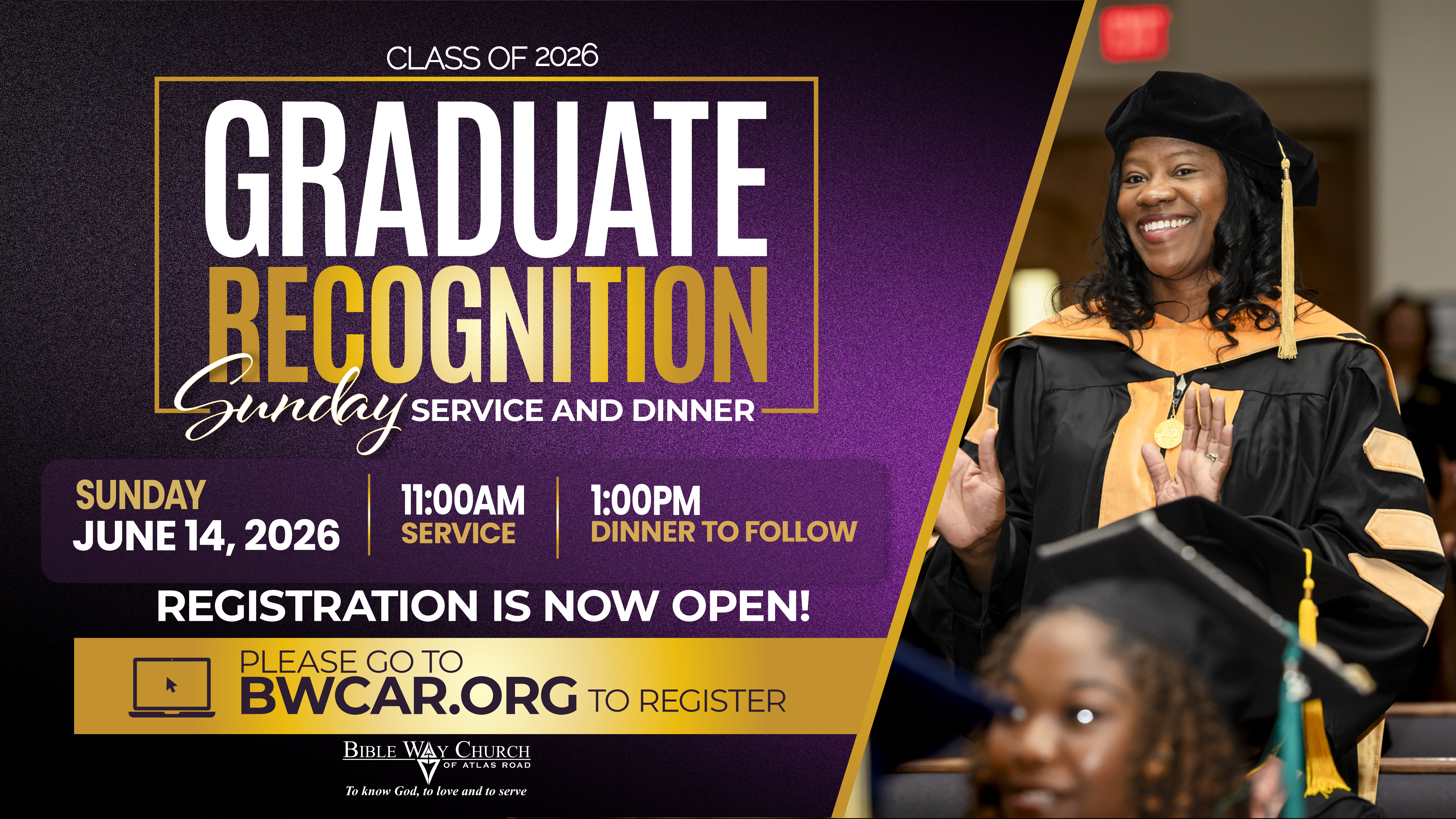 Registration is now open for our Graduate Recognition Service and Dinner that will be held on Sunday, June 14. All high school and college graduates will be recognized during our 11:00am service with dinner to follow at 1:00pm at the A. C. Jackson Wellness Center for all graduates and their families. Please go to bwcar.org to register.
