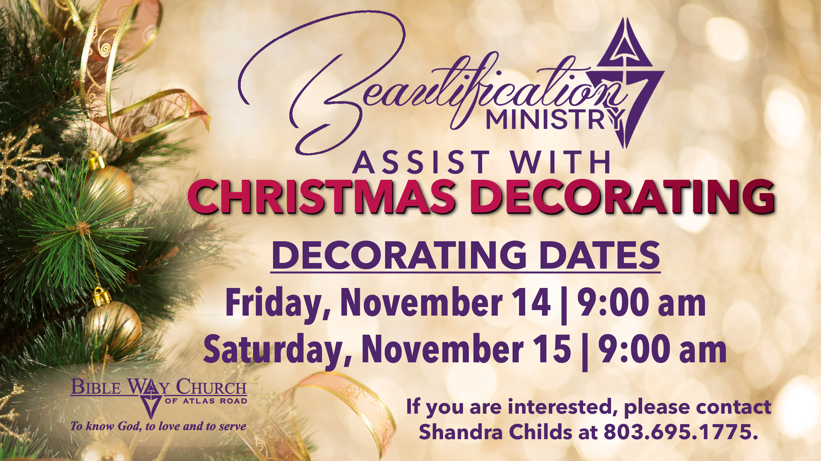 Beautification Ministry is requesting assistance with Decorating Christmas trees around the church campus on Friday, November 14, at 9:00 am and Saturday, November 15 at 9:00 am. Please contact Shandra Childs at 803.695.1775 if you would like to be a part of the Christmas Tree decorating team.