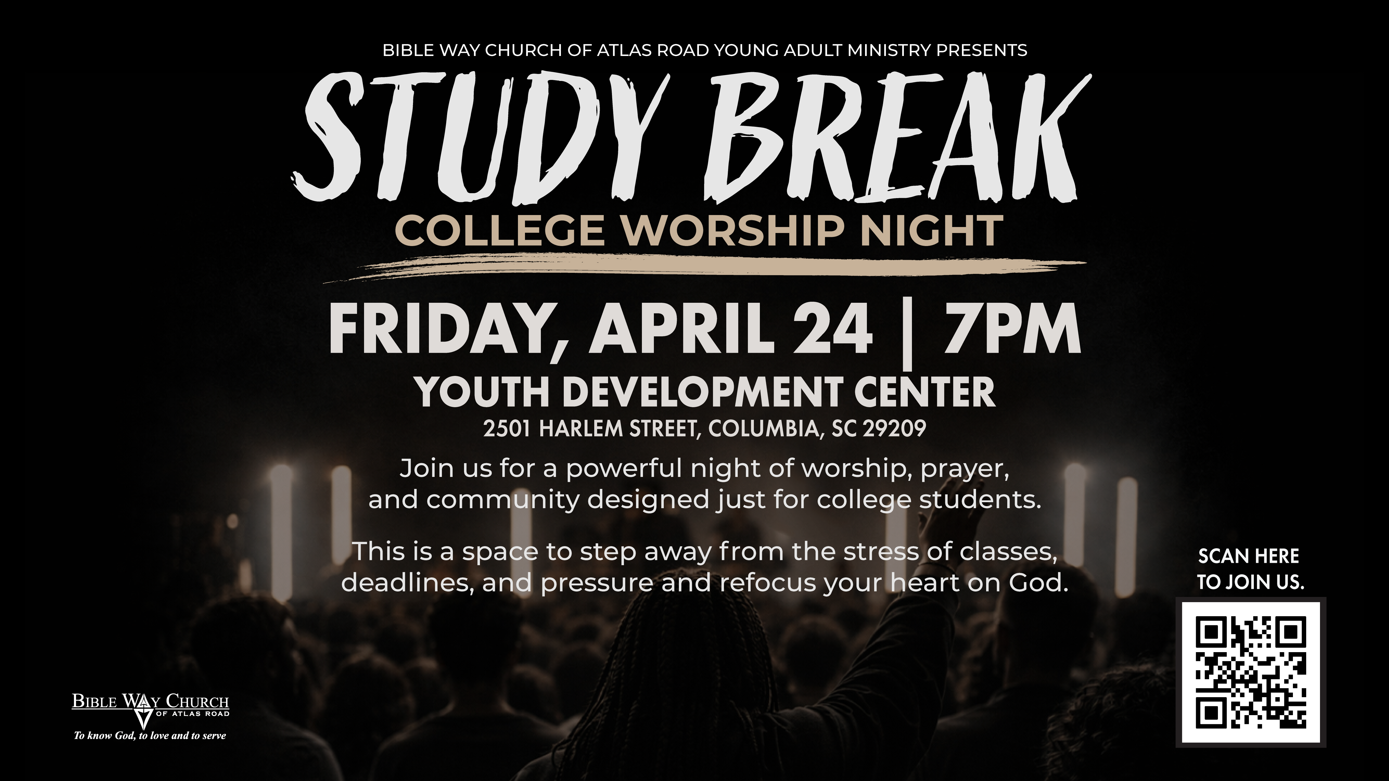 Young Adults host Study Break: College Worship Night. College students, this night is for you! Join us for a powerful night of worship, prayer, and community designed just for college students. This is a space to step away from the stress of classes, deadlines, and pressure and refocus your heart on God. Join us at 7:00pm in the YDC.