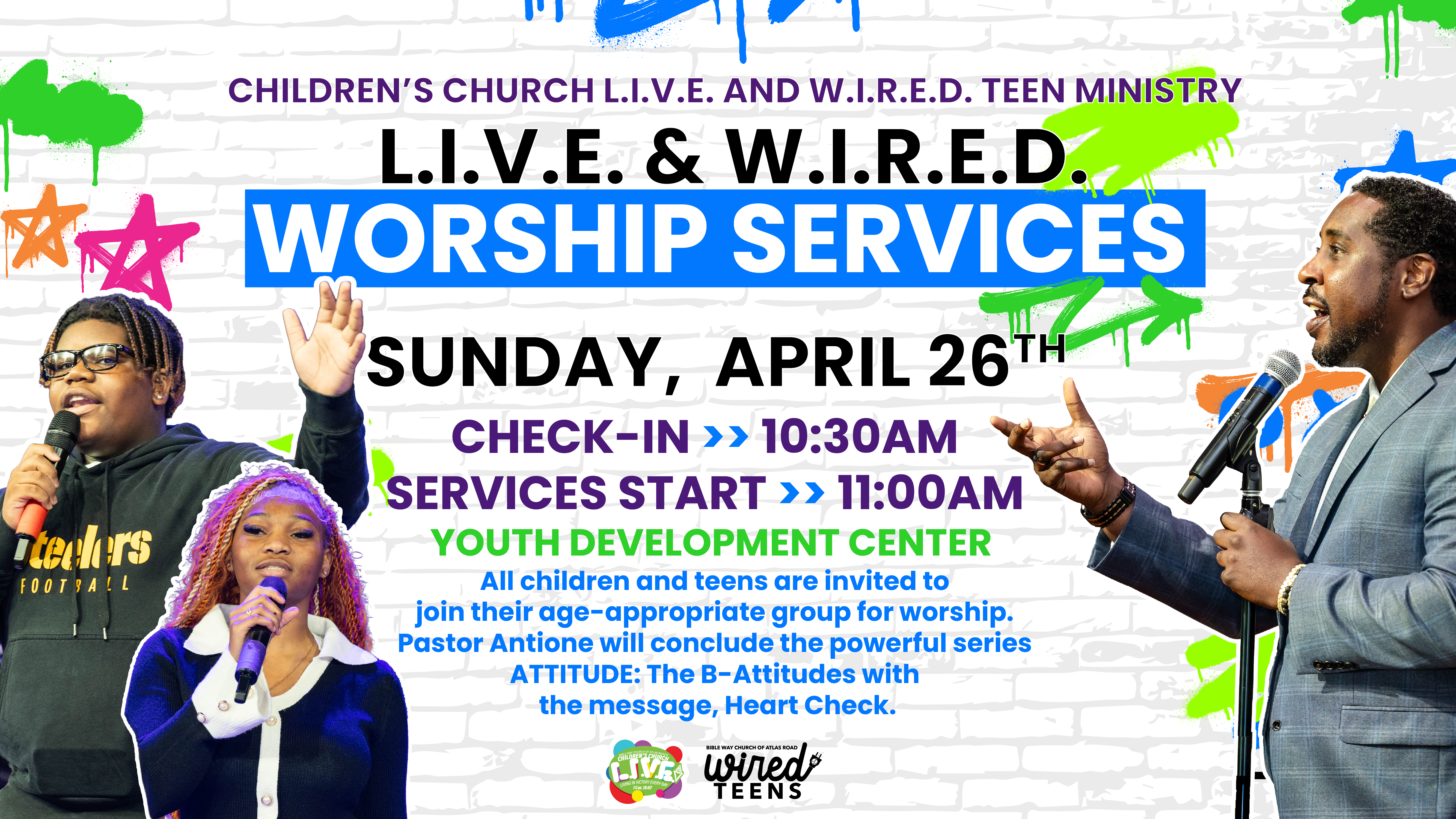 Sunday, April 26. Children and teens will have LIVE and WIRED services at 11:00am in the Youth Development Center. All children and teens are invited to join their age‑appropriate group for worship. This Sunday, Pastor Antione will conclude the powerful series ATTITUDE: The B‑Attitudes with the message, Heart Check—because before God changes your habits, He checks your heart. All teens are invited to WIRED Youth Service to discover what it truly means to be pure in heart and why your heart posture matters to God.
