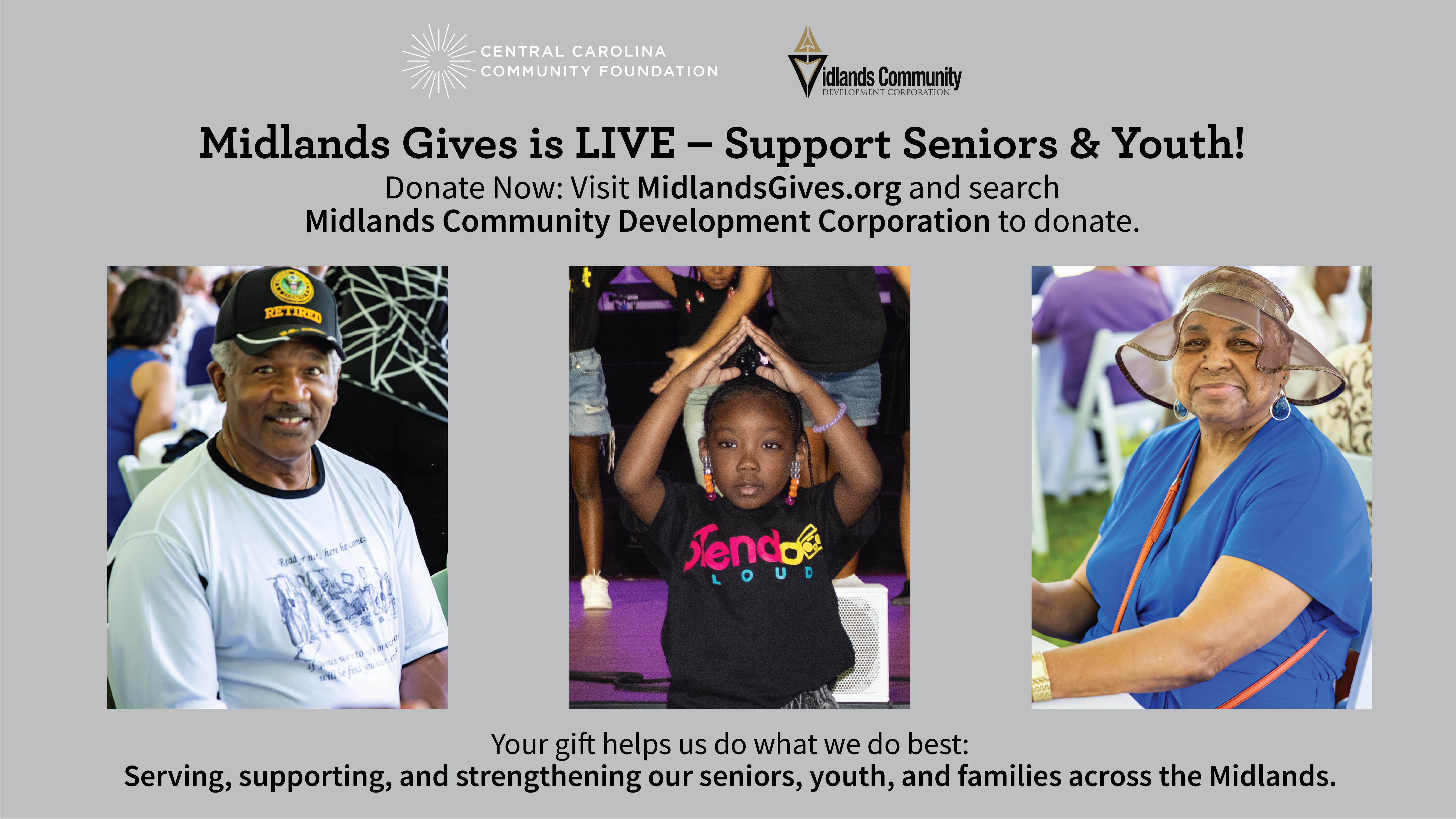 Wednesday, April 1 marks the start of Midlands Gives, an online giving campaign that provides opportunities for the community to support participating nonprofits. Each year, the Midlands Community Development Corporation participates in Midlands Gives to help raise much‑needed funds for our Seniors Program and Youth Summer Program. This is a great opportunity to support our Dream Keepers Seniors Program and our Youth Summer Camps. Early giving begins April 1, and we encourage everyone to give online through this campaign. The official Midlands Gives Day of Giving is Tuesday, May 5. To give early or on the Day of Giving, please visit bwcar.org or midlandsgives.org.