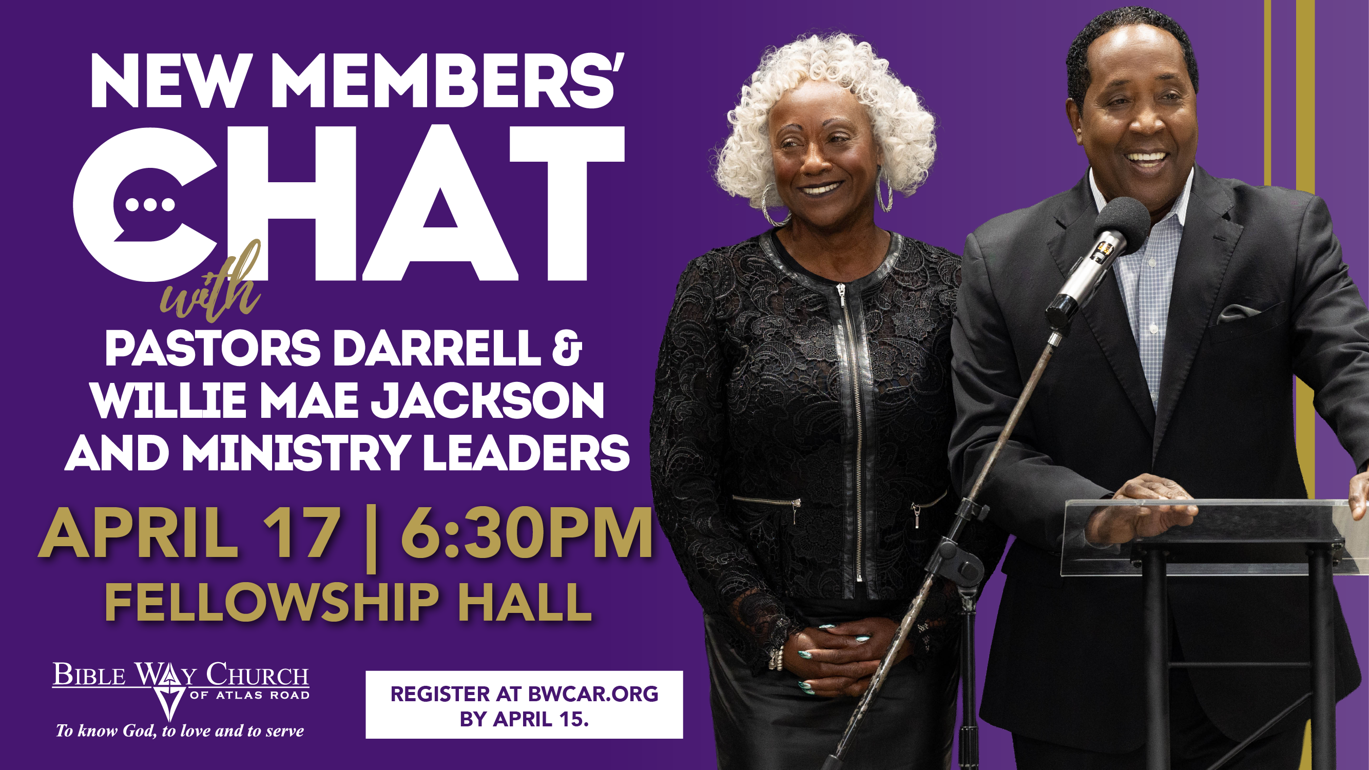 We are excited to announce that on Friday, April 17 we will have a special New Members’ Chat with Pastor Darrell & Willie Mae Jackson and ministry leaders at 6:30pm in the Fellowship Hall. All new members and their families are invited to join us for casual fellowship, a meal, and open discussion. Register at bwcar.org no later than Wednesday, April 15