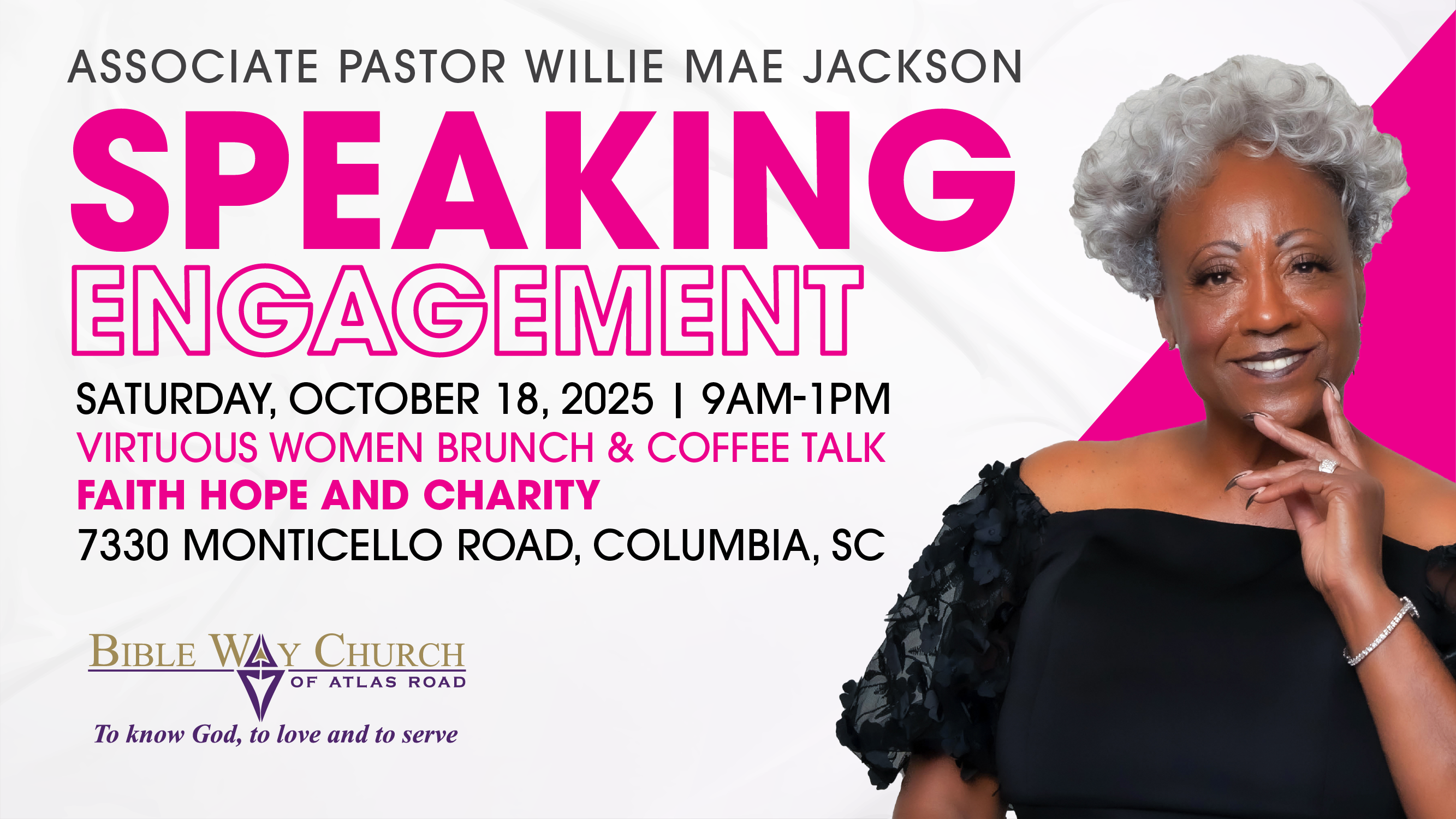 Pastor Willie Mae Jackson will be the guest speaker at Faith Hope and Charity, 7330 Monticello Road, Columbia, from 9:00am-1:00pm. Please save the date and plan to join her there.
