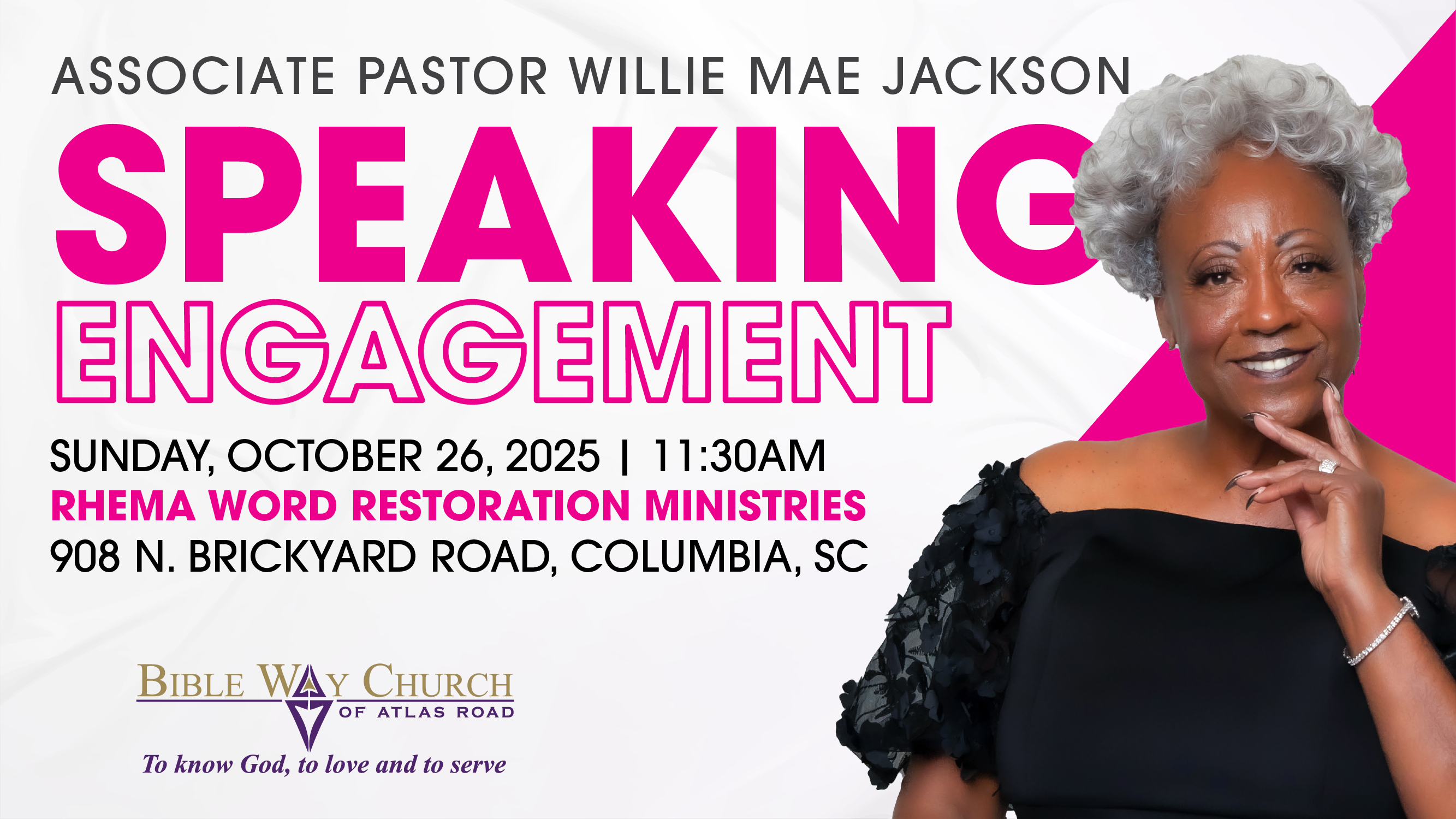 Pastor Willie Mae Jackson is the guest speaker at Rhema Word Restoration Ministries at 11:30am. Rhema Word Restoration Ministries is under Pastor Parrott, and is located at 908 N. Brickyard Road, Columbia, SC. You are invited to join her there.