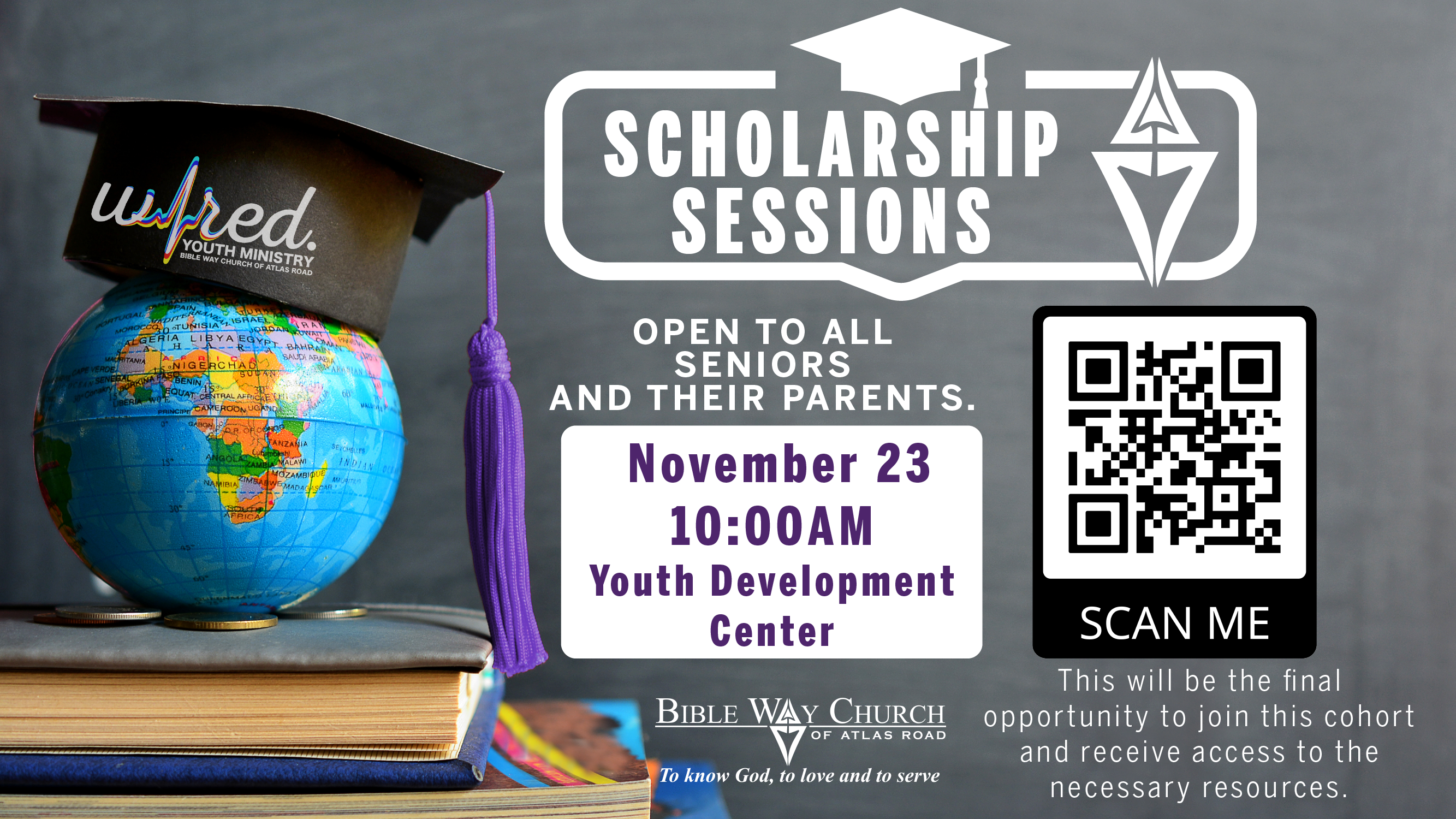Attention high school seniors and parents: The Scholarship Ministry will officially begin its regular sessions on Sunday, November 23 at 10:00am in the YDC.