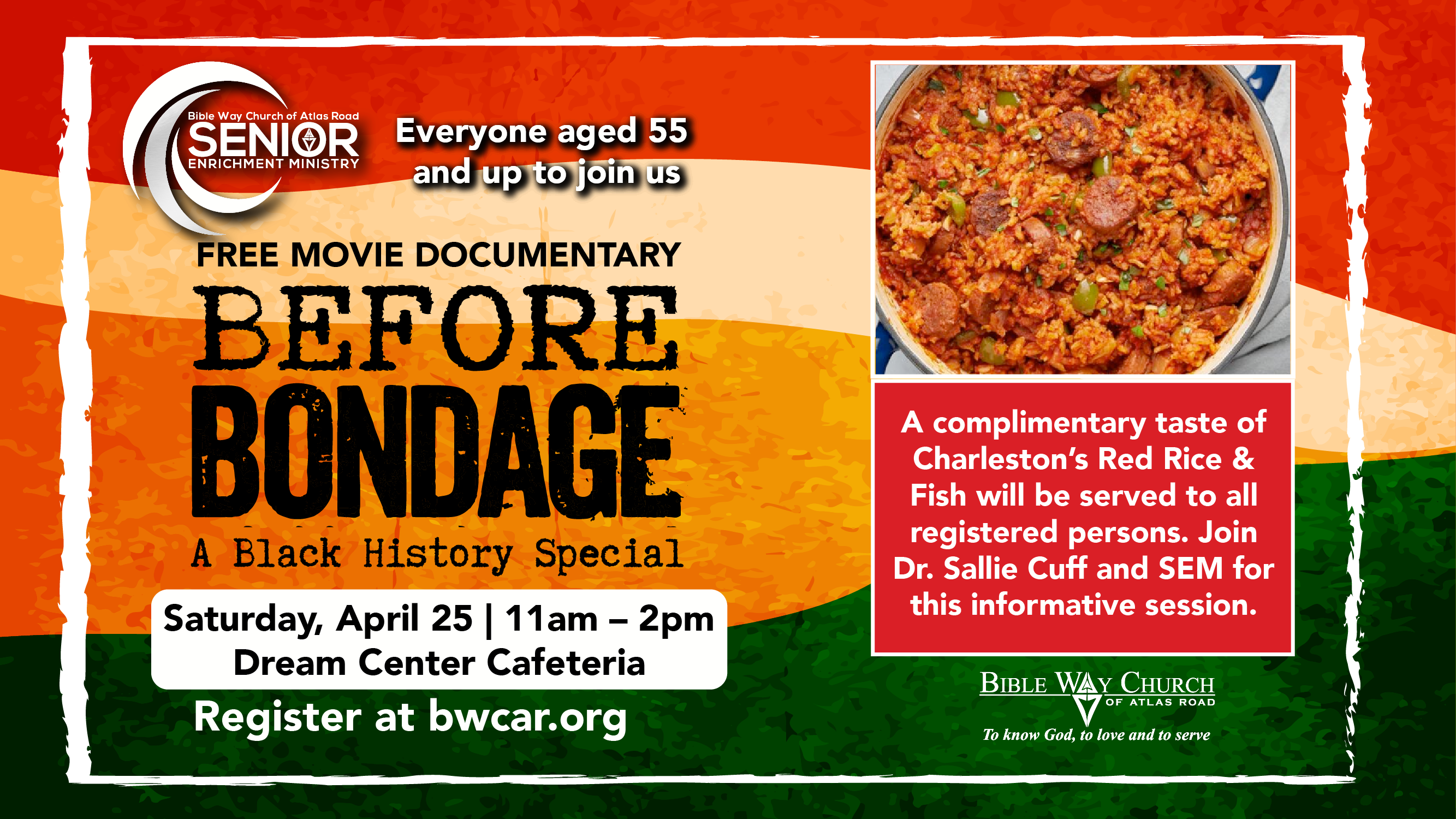 The Senior Enrichment Ministry (SEM) invites everyone ages 55 and up to join us for a free movie documentary, Before Bondage – A Black History Special, from 11:00am to 1:00pm in the Fellowship Hall, narrated by Dr. Jessica Berry, founder of the Okra Soup Foundation, Gullah Geechee scholar, and author; a complimentary taste of Charleston’s Red Rice will be served to all registered participants