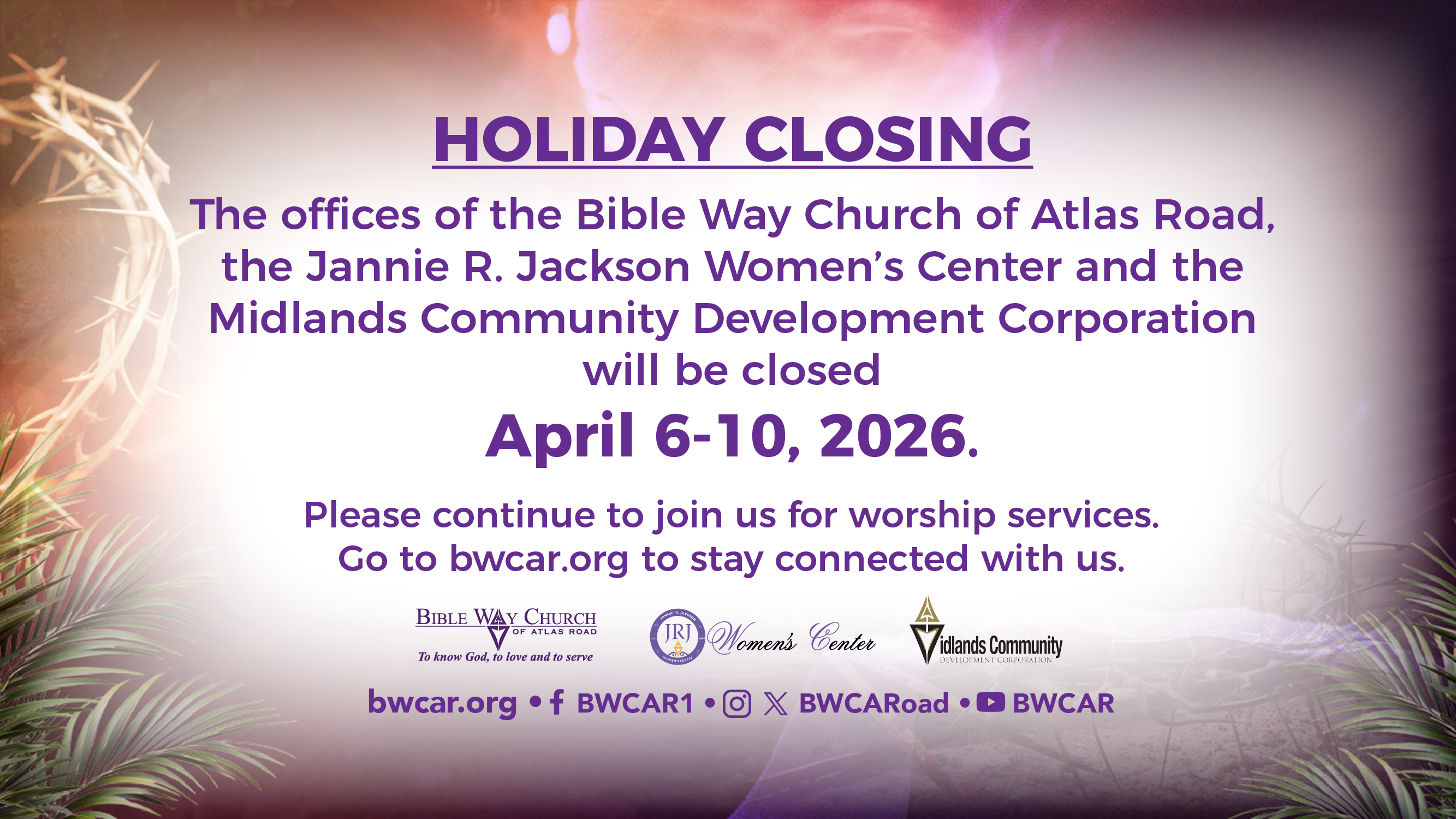 The offices of the Bible Way Church of Atlas Road, the Jannie R. Jackson Women’s Center, and the Midlands Community Development Corporation will be closed April 6-10.