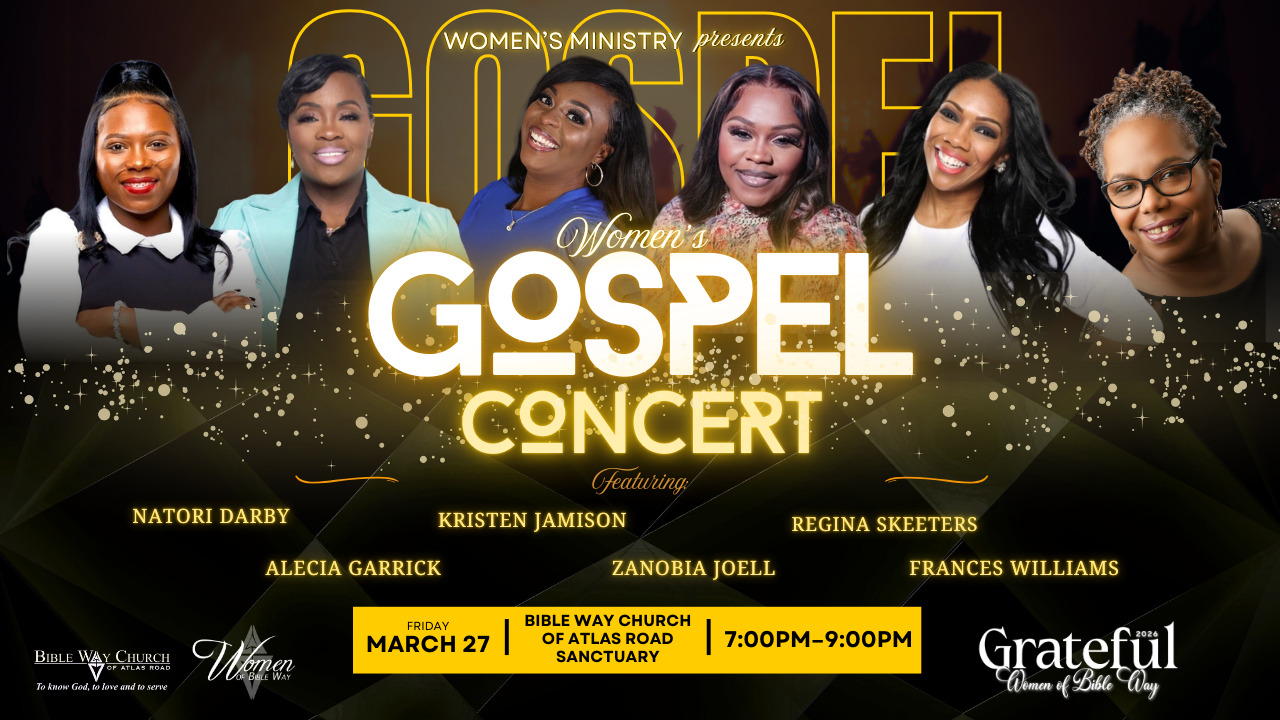 Join the Women’s Ministry for a soul-stirring Gospel Concert from 7:00pm–9:00pm in the Sanctuary. This event is open to everyone, and we invite you to be part of an unforgettable evening of praise and worship. Experience a powerful lineup of anointed voices, including Natori Darby, Alecia Garrick, Kristen Jamison, Zenobia Joell, Regina Skeeters, and Frances Williams. This will truly be a concert like no other filled with inspiration, joy, and the presence of God. Save the date, bring a friend, and come worship with us!